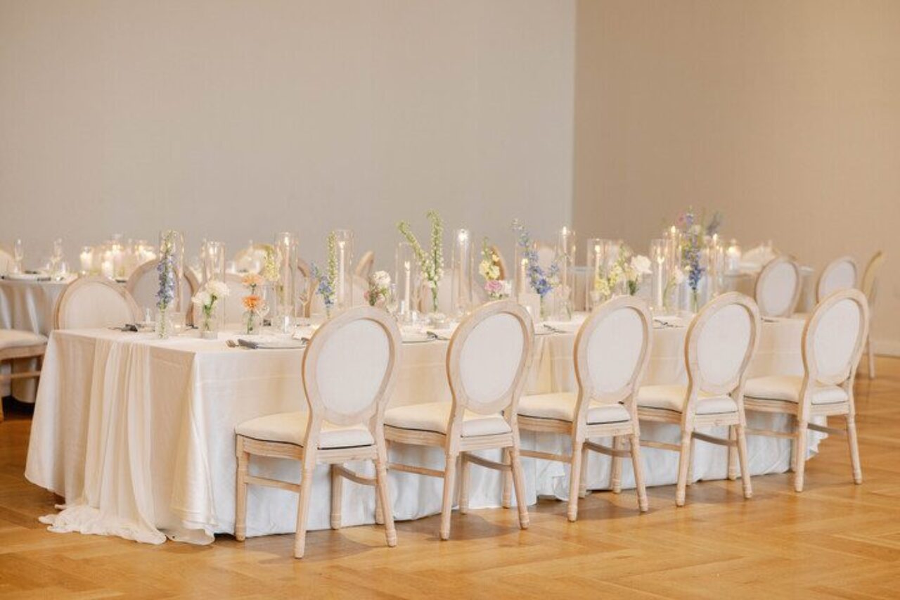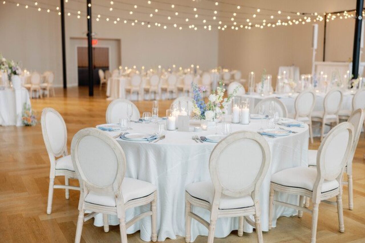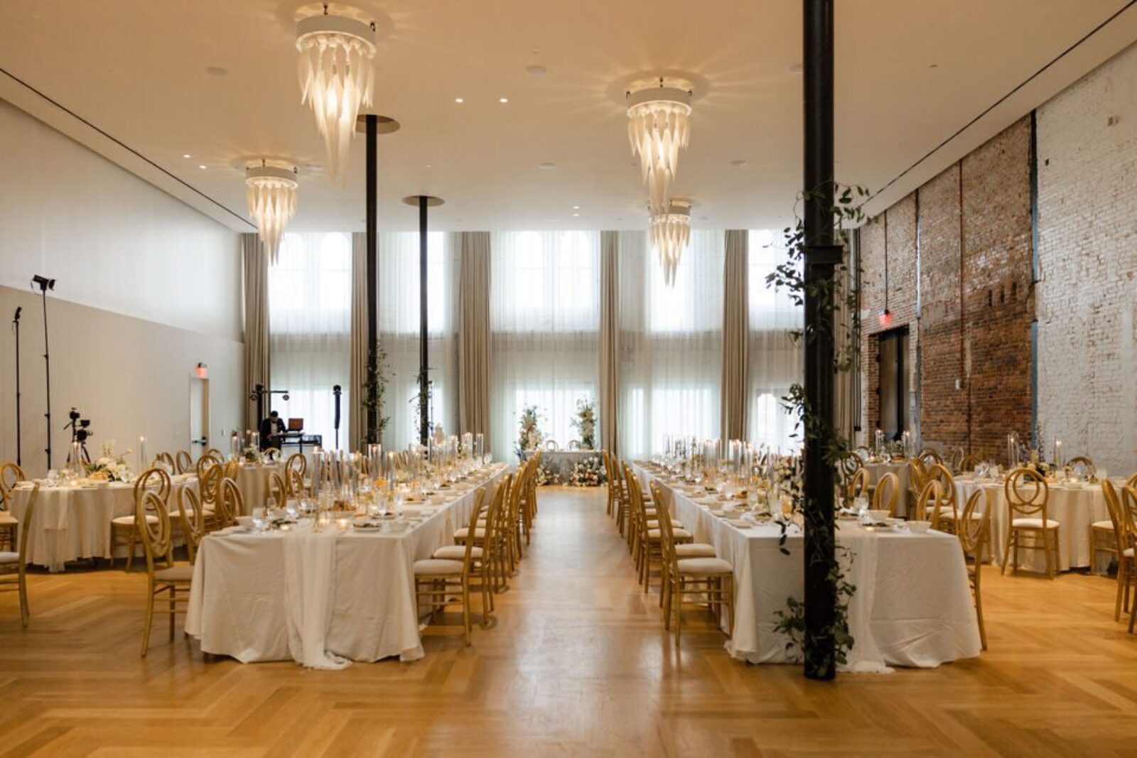 The Valencia Ballroom’s architecture, featuring soaring two-story room heights and maximum natural light, is further enhanced by impeccable details that include whitewashed brick walls, herringbone wood floors, and custom blown glass chandeliers.